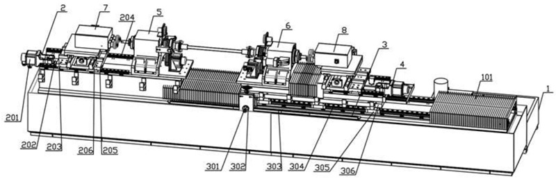為了解決上述問(wèn)題,本實(shí)用新型的目的在于提供了一種磨削效率高、管體兩端直線度好、適用不同長(zhǎng)度的管體磨削和開(kāi)環(huán)形槽的碳化硅管體雙頭打磨車床。
