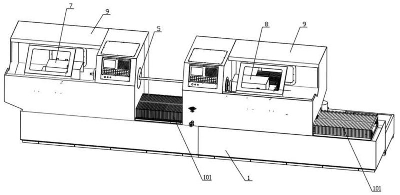 圖5是本實(shí)用新型碳化硅管體雙頭打磨車床的長(zhǎng)管加工示意圖;