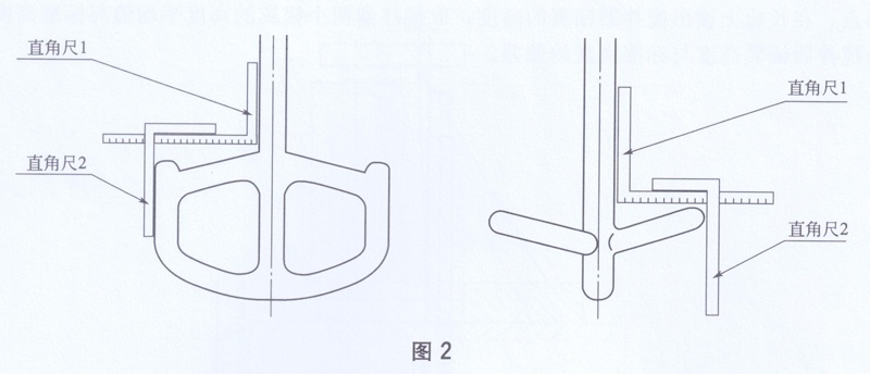 將待測攪拌器放平或豎直,如圖2所示,直角尺1的一邊貼靠在攪拌器上,另一邊與直角尺2的一邊平行貼靠,直角尺2的一邊觸碰到錨翼的端部,在直角尺1上讀取錨翼寬度值(這個值應為錨翼端部距攪拌器軸面的最小值)。在攪拌器的另一錨翼做相同測量。對稱錨翼的錨翼寬度最大值與最小值的差為攪拌器錨翼對稱度。