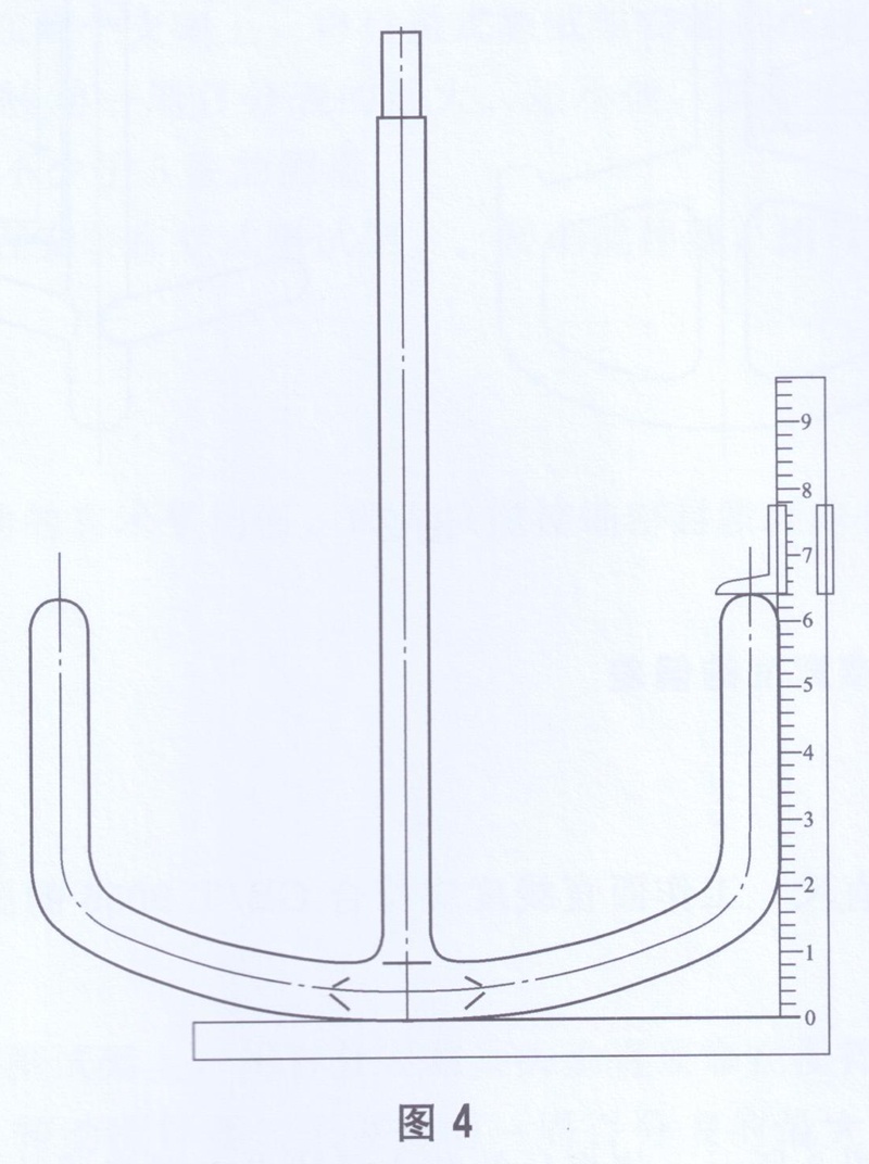 將待測(cè)攪拌器放平,如圖4所示,將直角尺的長邊和短邊緊貼在攪拌器錨翼上,移動(dòng)滑塊到攪拌器錨翼端點(diǎn),在長邊上讀出攪拌器錨翼的高度,取攪拌器兩個(gè)錨翼的高度平均值與標(biāo)準(zhǔn)高度之差的絕對(duì)值作為攪拌器錨翼高度與標(biāo)準(zhǔn)高度的偏差。