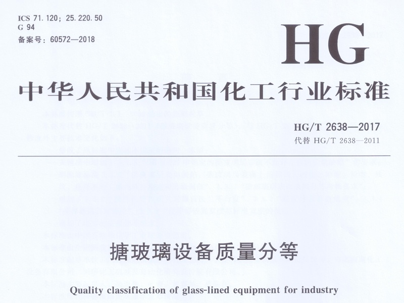 2021-04-25HG/T 2638-2017搪玻璃設(shè)備(或部件)質(zhì)量等級評定。5.1、優(yōu)等品搪玻璃設(shè)備(或部件):5.1.1 優(yōu)等品各項指標(biāo)及檢測方法全部執(zhí)行現(xiàn)行標(biāo)準(zhǔn);5.1.2 優(yōu)等品關(guān)鍵項全部達到現(xiàn)行標(biāo)準(zhǔn)規(guī)定指標(biāo),5.1.3 設(shè)備(或部件)主要項、一般項全部達到優(yōu)等品指標(biāo)。