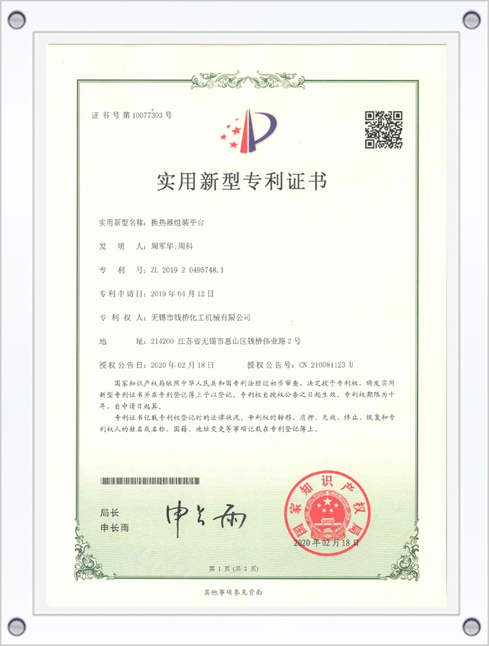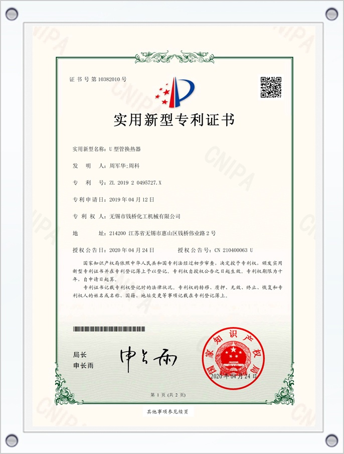碳化硅換熱器外側(cè)密封裝置專利證書